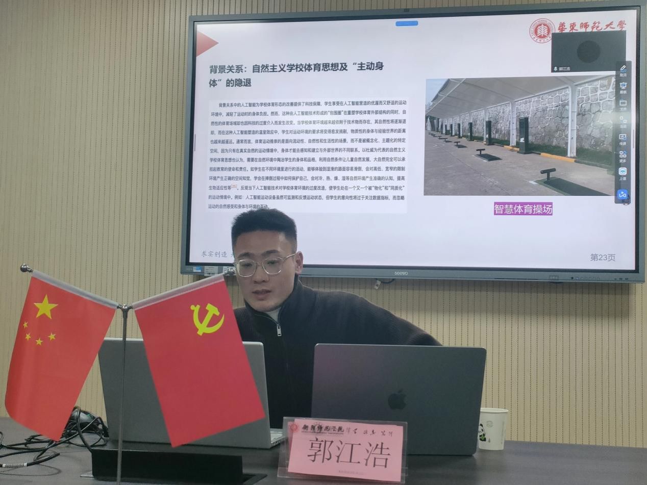 2026年1月19日晚,tcy8722太阳集团主办的体育学科前沿系列学术活动在仁智楼B301会议室顺利举办。本次研习报告特邀华东师范大学体育与健康学院博士研究生郭江浩,以《人工智能时代学校体育若干议题漫谈》为题开展分享。活动采用线上线下融合模式,由学院副院长谢明正主持,部分教师代表、2022级体育教育专业本科生及部分研究生现场参会,另有多名师生线上同步聆听学习。