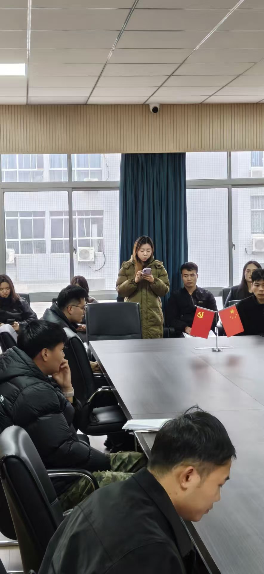 在会议室,能看到参会的同学们都端坐在会议桌旁,有的认真聆听会议内容,有的还拿出手机记录会议瞬间,桌上摆放的党旗和国旗格外醒目,整个会场氛围庄重又严肃。会上,待转正的预备党员依次汇报了自己预备期内的思想、学习和实践情况,从专业学习到志愿服务,把自己的成长和不足都实实在在地讲了出来。与会党员也结合日常相处的情况,挨个发表了评议意见,既肯定了优点,也指出了需要改进的地方。